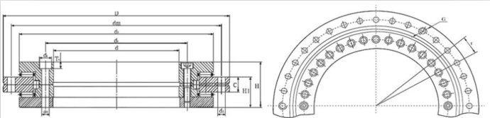 YRT標準型轉臺軸承(推力-向心組合軸承)可同時承受雙向軸向/徑向載荷和傾覆力矩。 軸承內圈和外圈上均有安裝孔,可以用螺栓直接固定。 YRT軸向徑向軸承適用于轉速較低,運轉周期較短,對剛性和回轉精度要求較高的場合,如回轉工作臺,分度頭,回轉銑頭等。