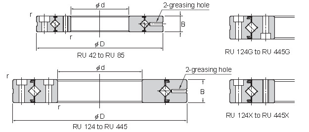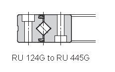 RU型(內外圈一體型),由于外圈和內圈都有安裝孔,安裝時不需要固定法蘭和支撐座。 另外,由于外圈和內圈均為整體結構,安裝對性能幾乎沒有影響,因此能夠獲得穩定的旋轉精度和扭矩,能用于外圈和內圈旋轉的場合。